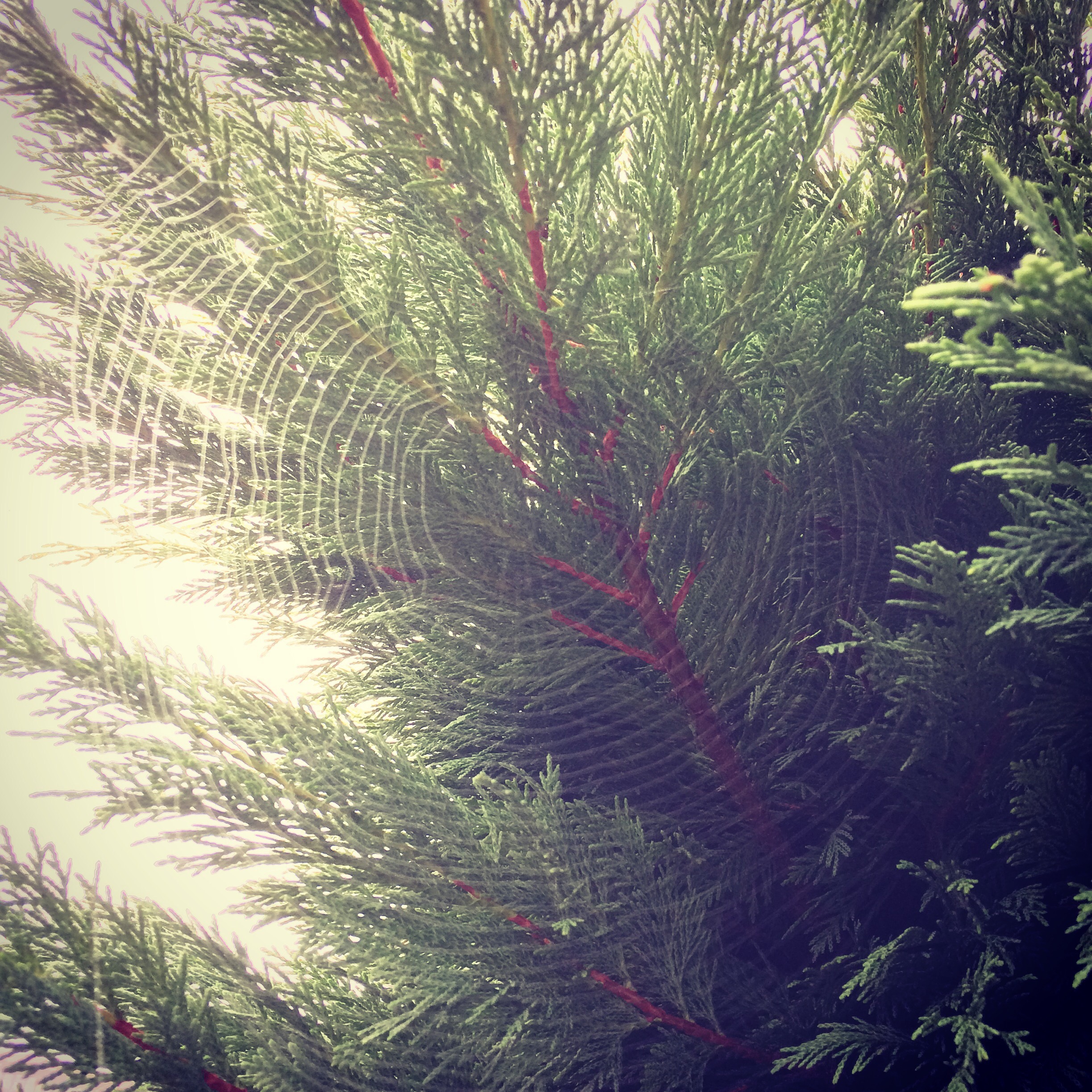 Telas de araña escarchadas sobre arizónica en una mañana húmeda, fresca y con neblina.