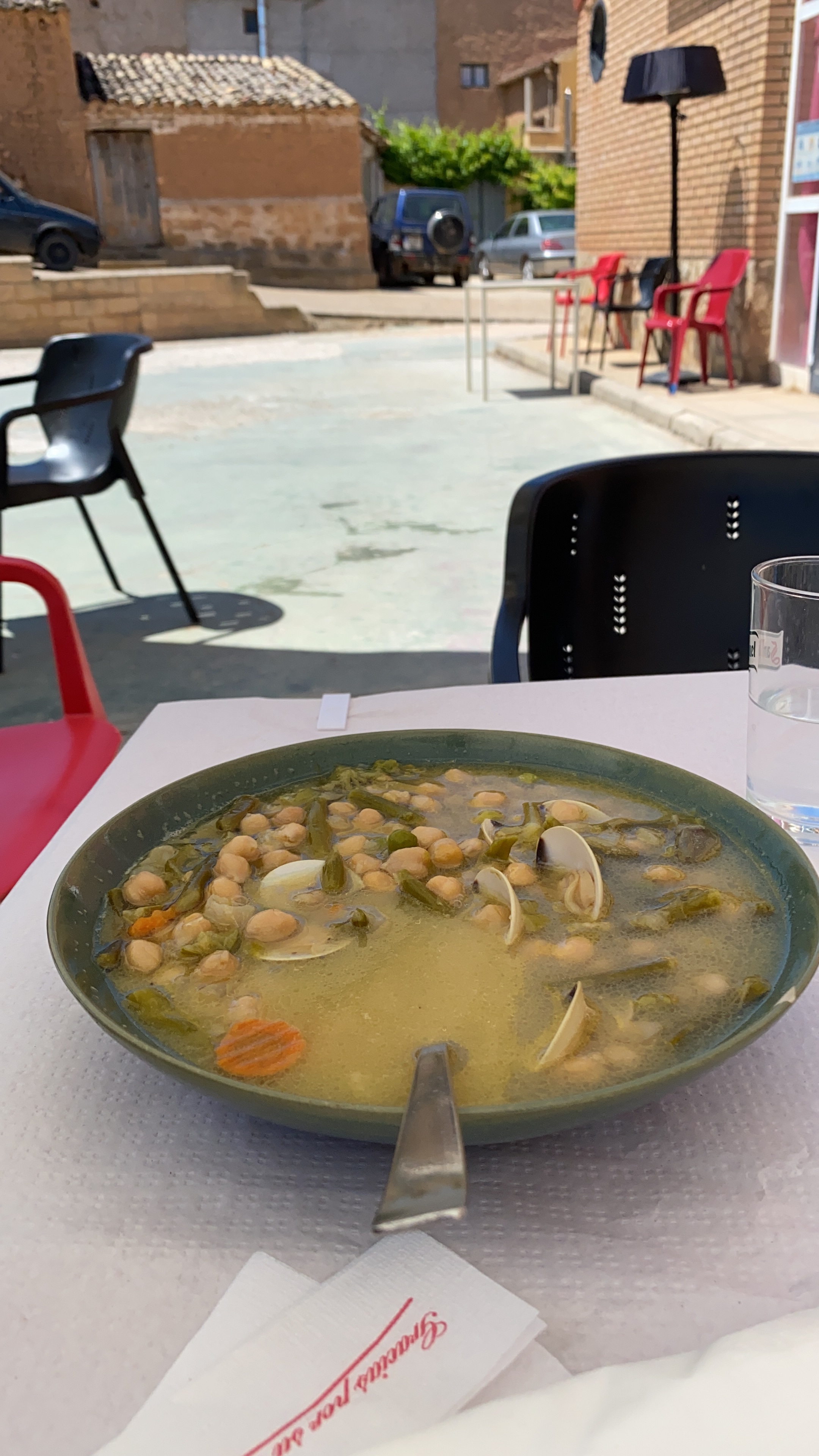 Garbanzos con Almejas y puerta de la muralla en Monteagudo de las Vicarías, Soria, Castilla y León. 9.6.2021