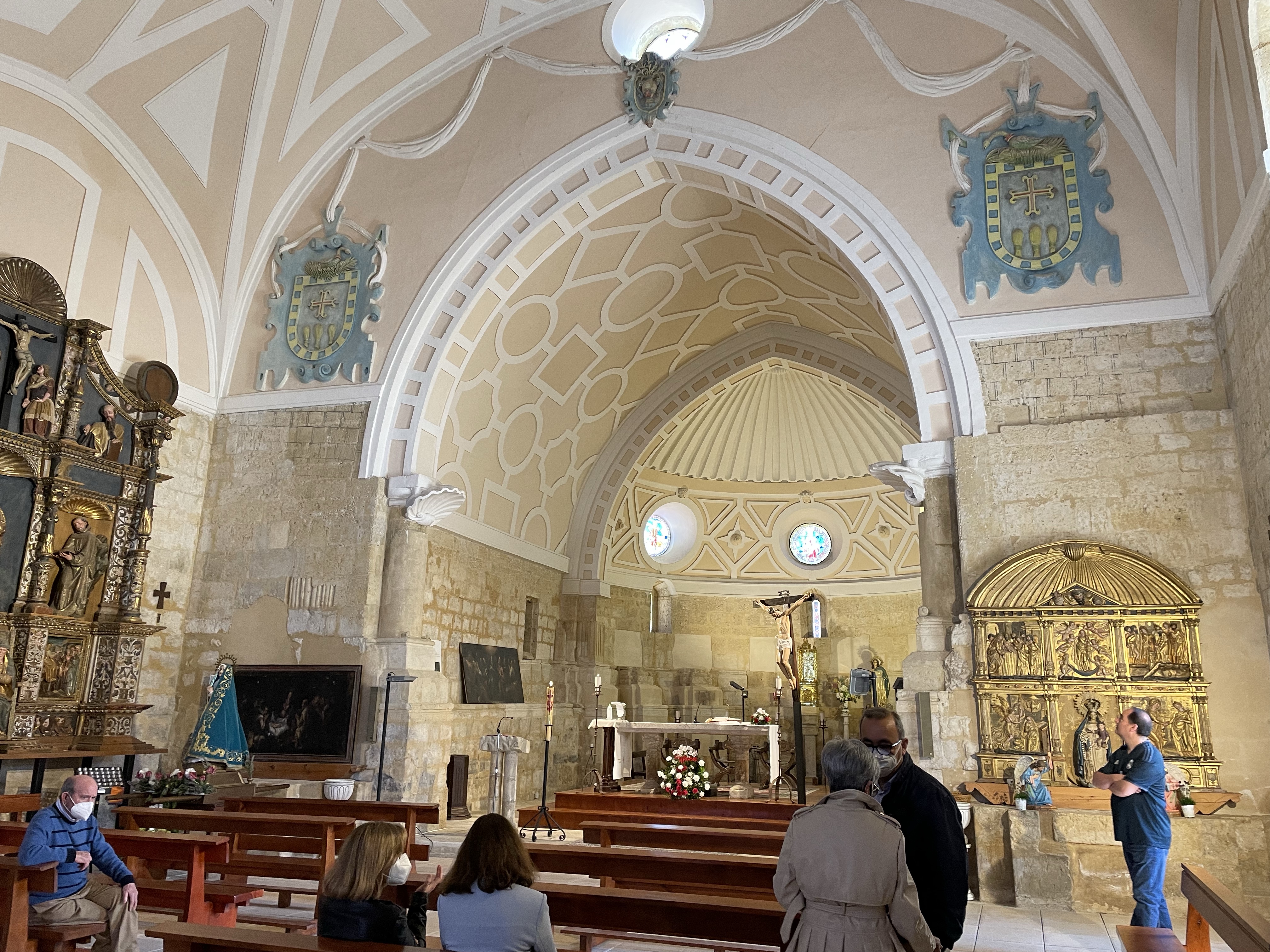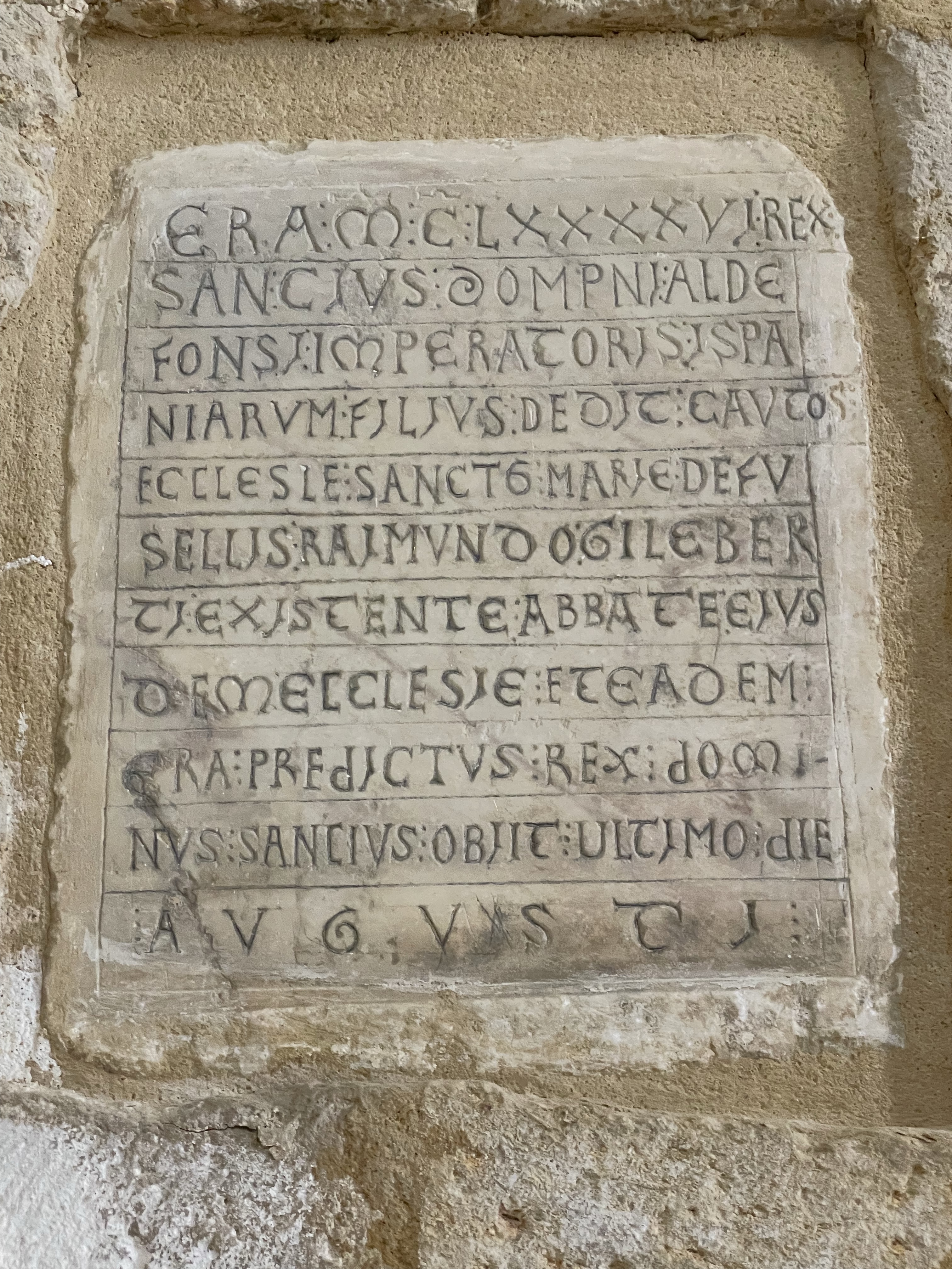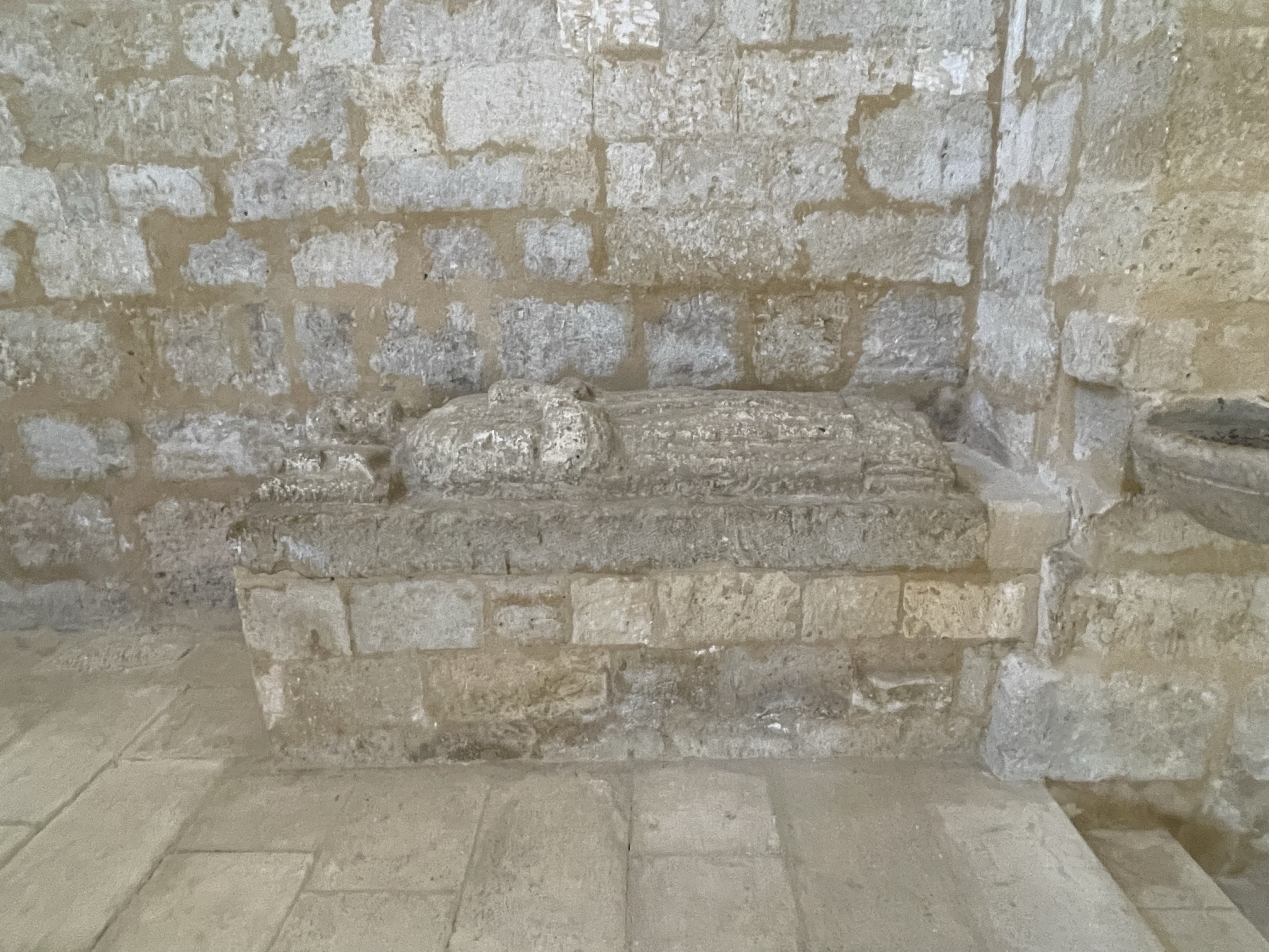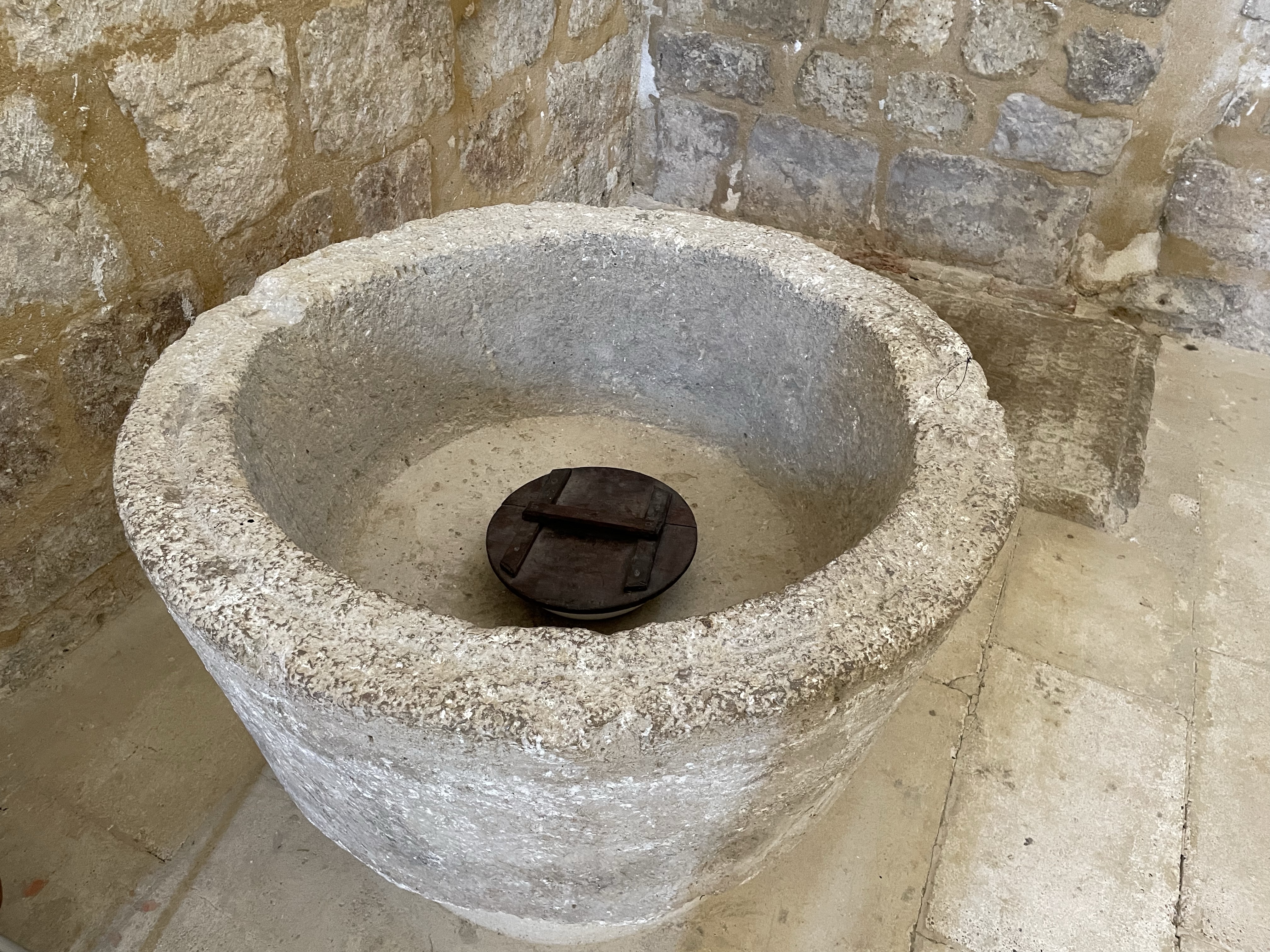 Pila bautismal, inscripciones y otros detalles en Iglesia Gótica s.X Santa Maria Husillos. Palencia. Castilla y León. 2022.05.02