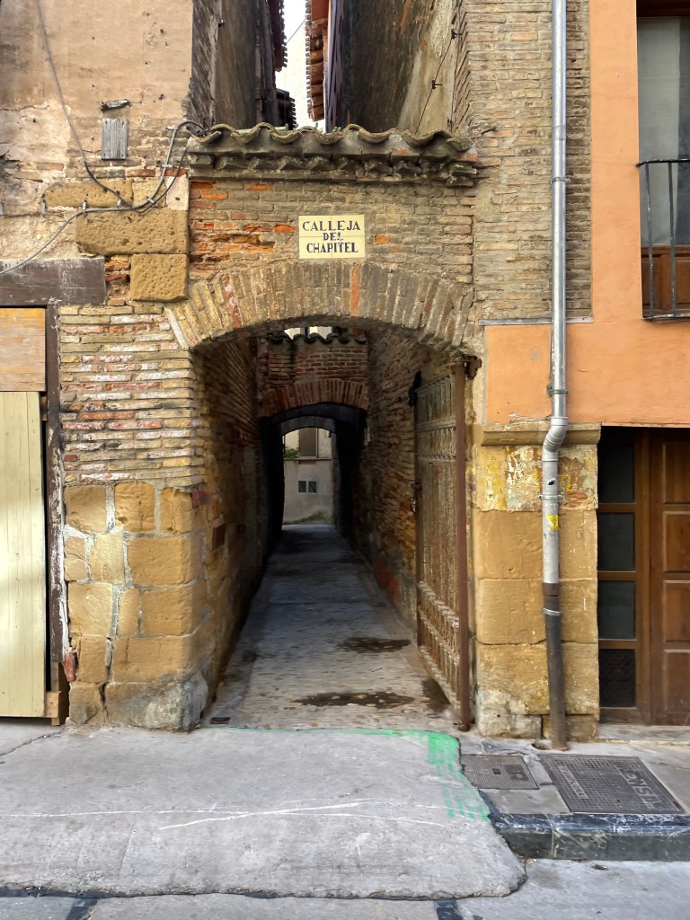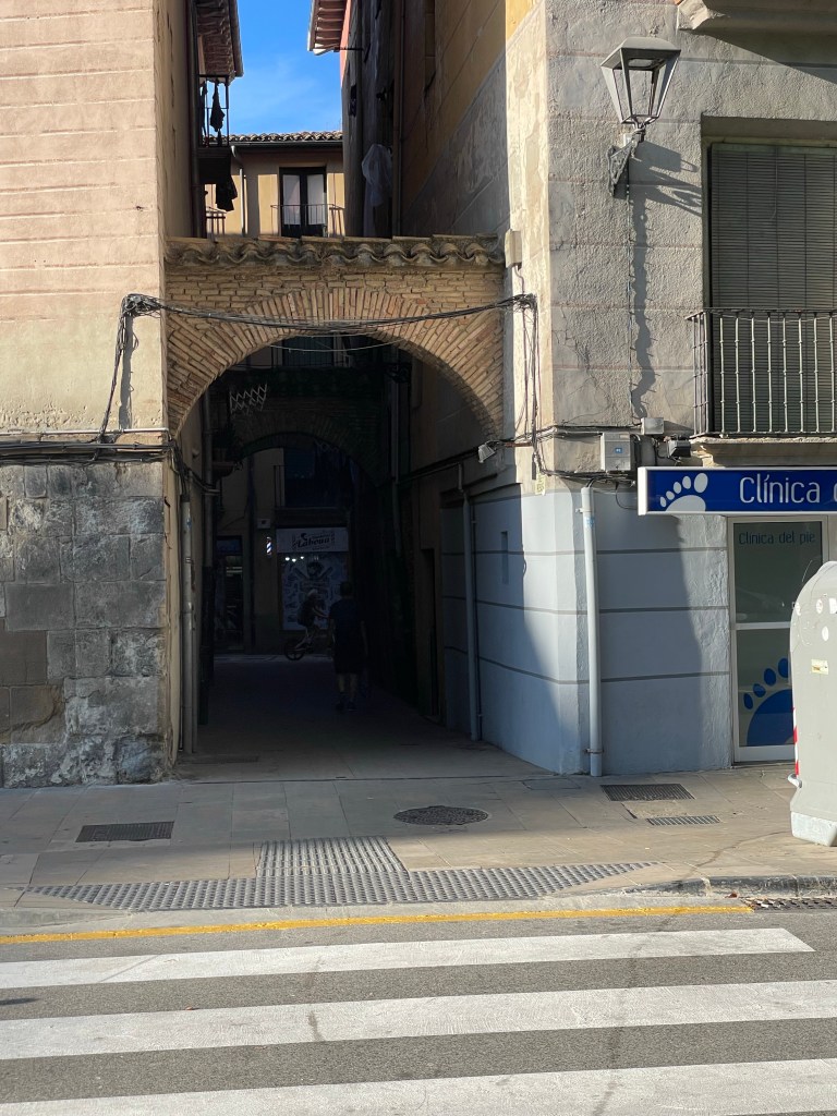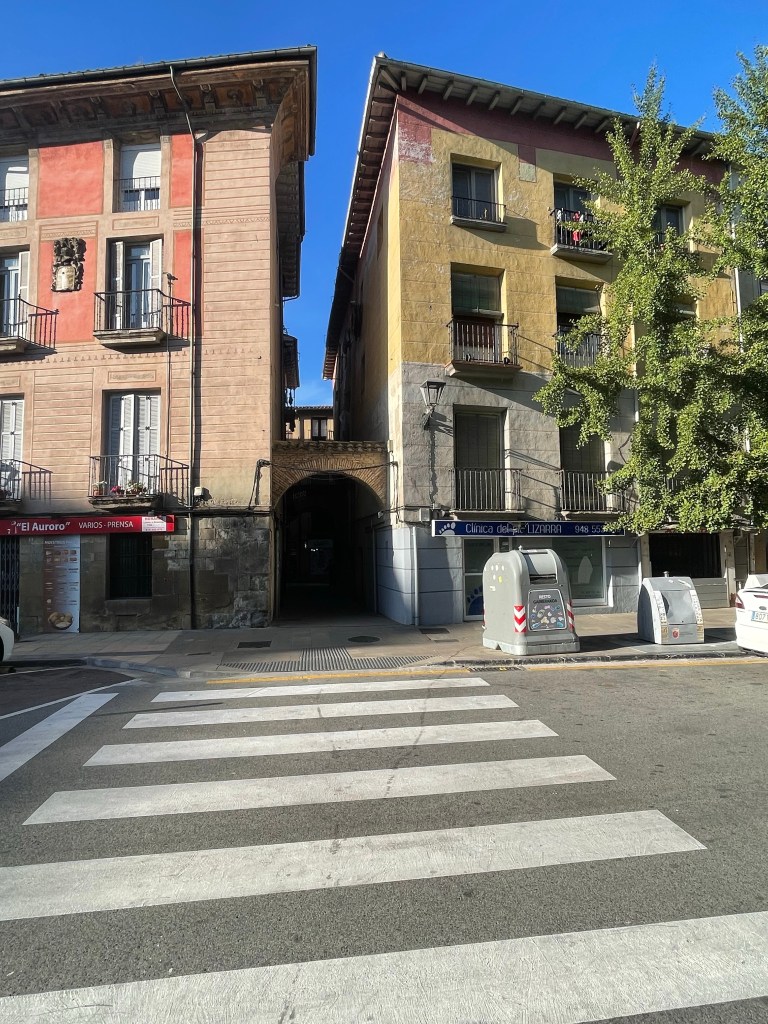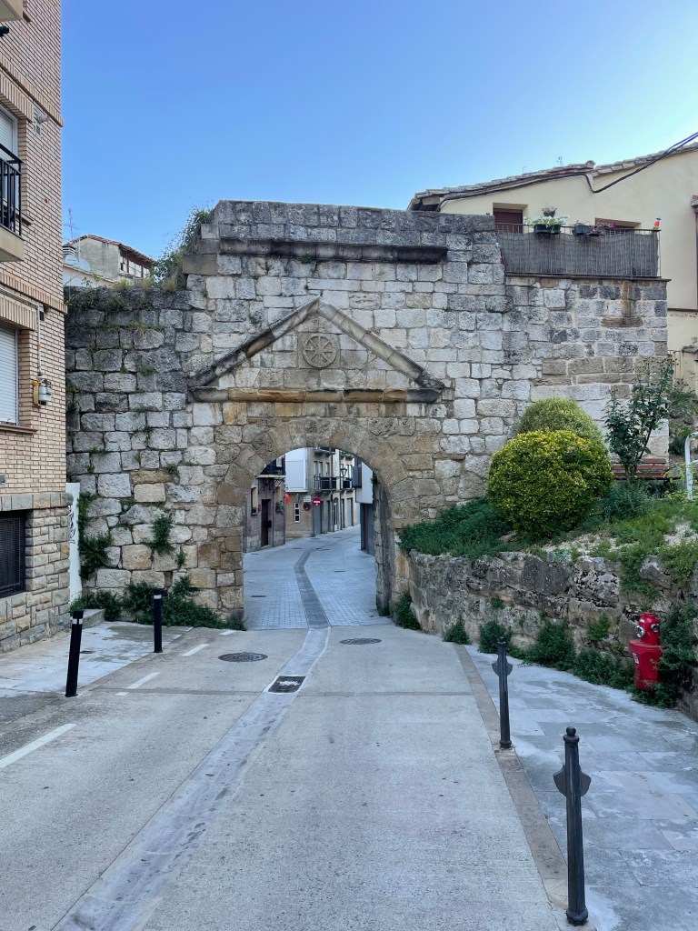 Detalles del Camino de Santiago a su paso por Obanos (Talanqueras, arco, iglesia y biblioteca en la calle). Pamplona, Navarra. 25.08.2024