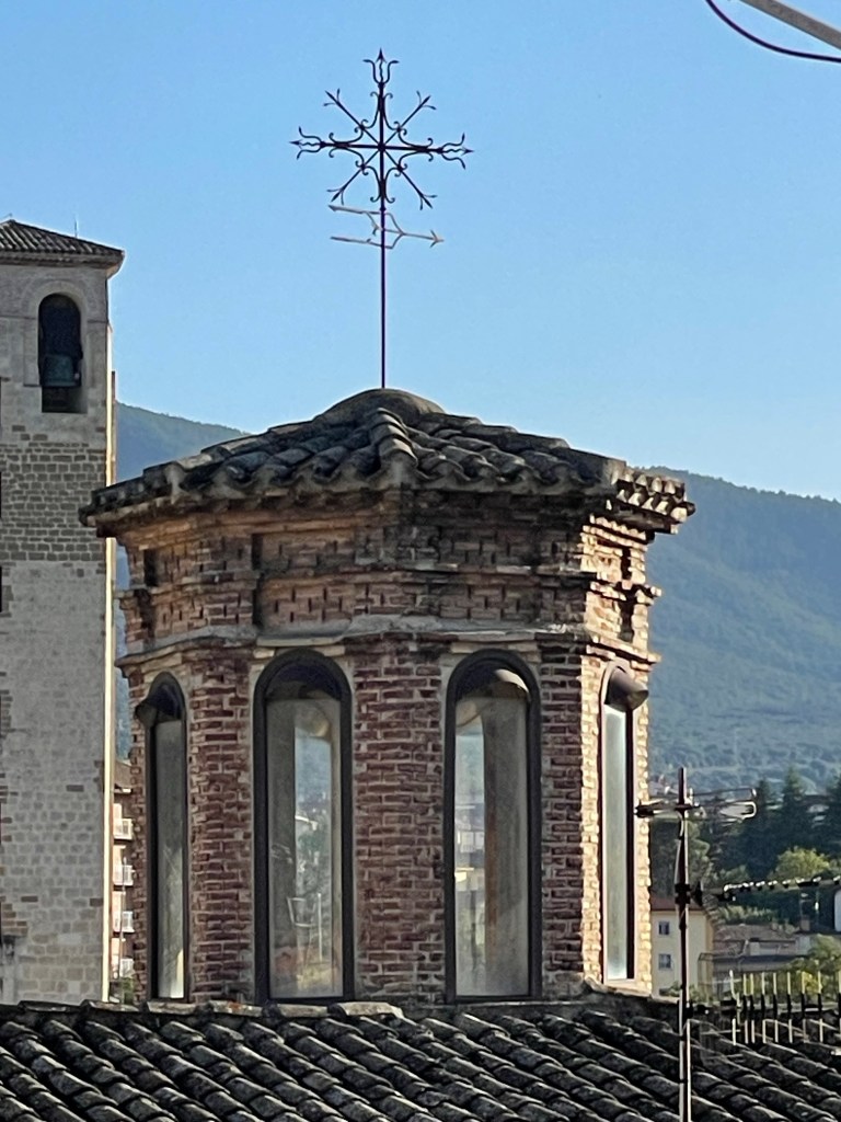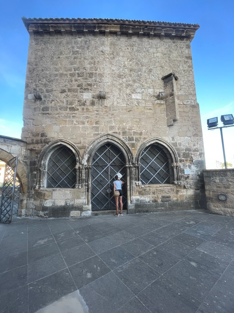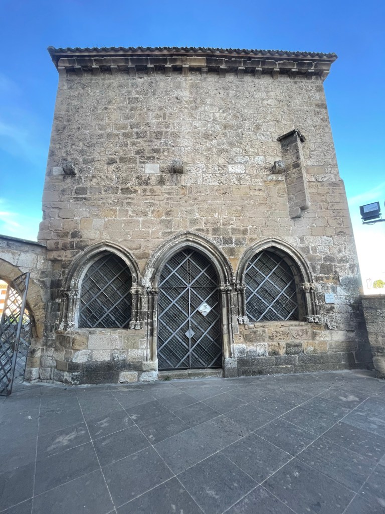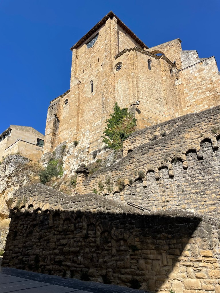 Detalles del Camino de Santiago a su paso por Obanos (Talanqueras, arco, iglesia y biblioteca en la calle). Pamplona, Navarra. 25.08.2024